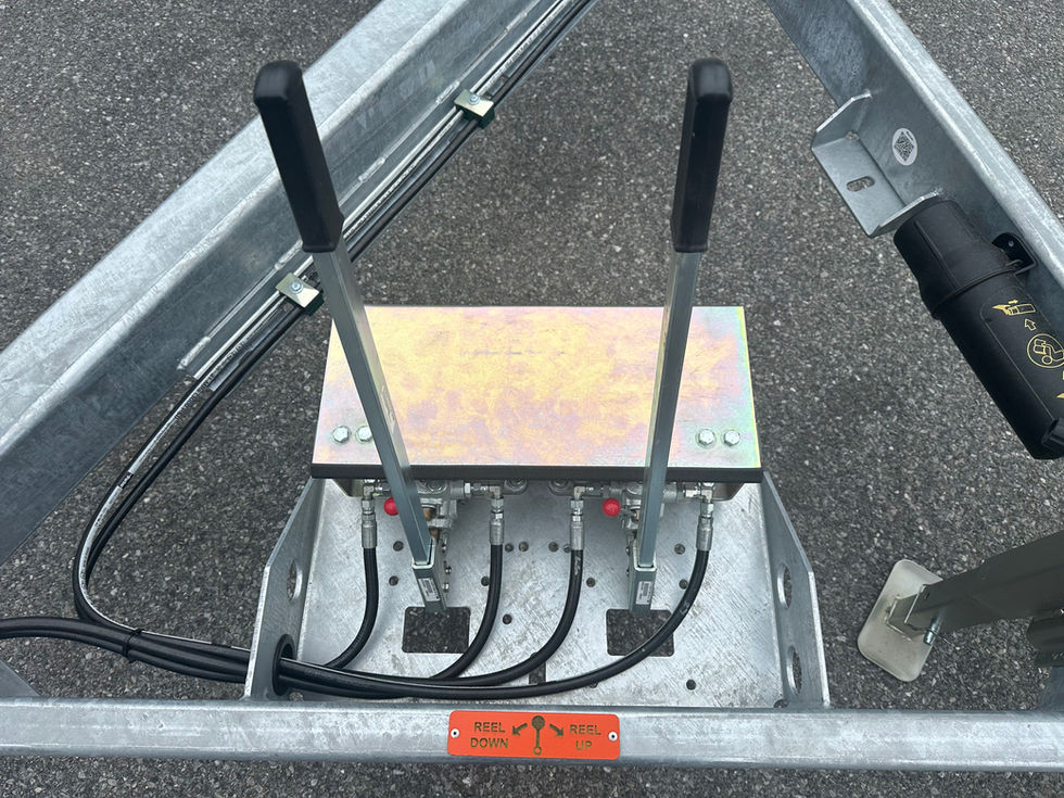 This severe duty unit is the industry's most ruggedly built gunrack reel trailer specially tailored for the underground market. It is impossible to lose a pin or reel on the highway because there are no pins to secure the reel. All REELSTRONG models are engineered to this end; however, the GR Powerlock II™ reel-securing design intuitively secures the reel with no possibility of losing a reel-securing pin that results in costly down time, maintenance, and possible liability. If the reel lock is not secured a red warning is visible in your rearview mirror. If it is locked, a green indicator is visible (see illustration below). The reel lock has a safety catch to ensure it is fully locked in place and will not pop out.